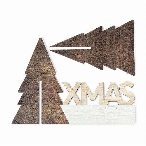 Christmas ornament with Christmas tree design, made of natural wood, with die-cut XMAS text and original bicolor finish.