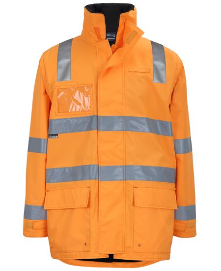 Classic fit , 300D Polyester oxford shell fabric with PU coating, waterproof rating to 20,000mm , 290gsm polar fleece body lining , 190T taffeta sleeve lining , Aust. Rail Orange with silver reflective tape , JBs reflective tape stands up to 50 times domestic wash , Two hoop tape on body and two rows on sleeve , Long line style, fully seam sealed , Detachable sleeve , Concealed hood inside collar , Wind flap with hook pile closure , ID patch pocket at right hand chest, tab on left hand chest , Complies with AS/NZS 1906.4:2010 and AS/NZS 4602.1:2011 Day and Night , Complies with AS 7471:2019 Australian Rail PPE minimum requirements , Complies with Standard AS 4399:2020 for UPF Protection (UPF 50+).