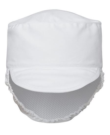 65% Polyester for durability, and 35% Cotton drill for comfort , Features peek cap, and fitted mesh hair cover and elastic back to ensure hair is properly covered , One size , Relaxed circumference - 58cm.
