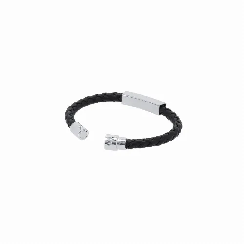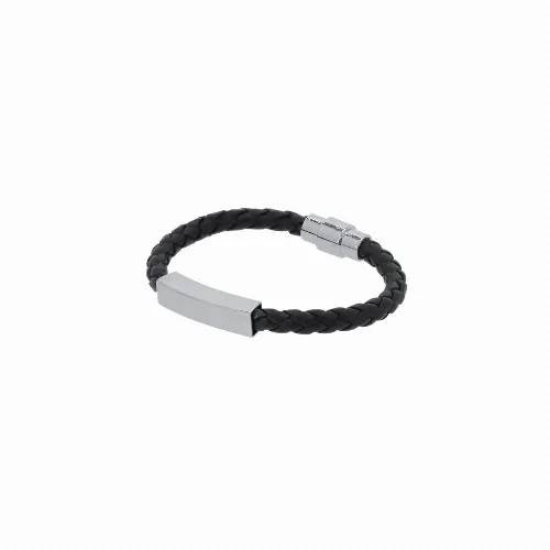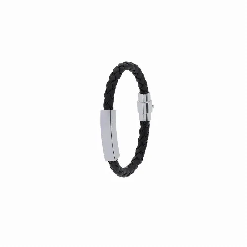 Black synthetic leather bracelet adorned with a plate made of polished stainless steel in flat design.