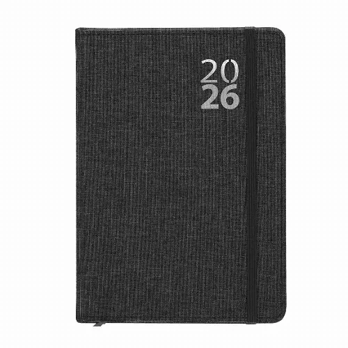 A5 size diary in soft and resistant RPET, with hard covers and elastic band closure.