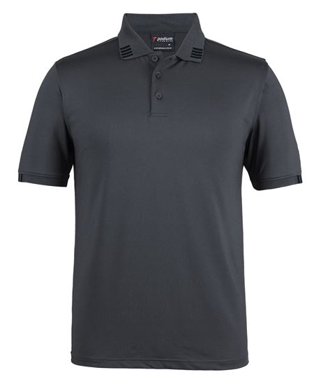 Urban fit , 93% Polyester for durability, and 7% Elastane for comfort , 170gsm stretch fabric , Podium Coola moisture wicking fabric to keep you cool and dry , Complies with Standard AS 4399:2020 for UPF Protection (UPF 50+) , Double sided jacquard collar and sleeve cuff with 4 contrast colour stripes , 3 Button placket , Straight hem with side split.