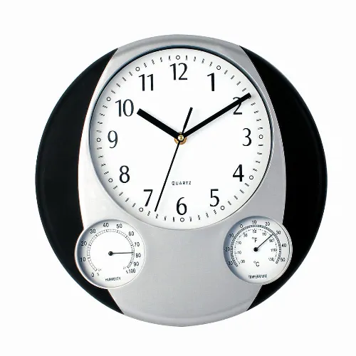Analog wall clock in circular design, with built-in thermometer and hygrometer.