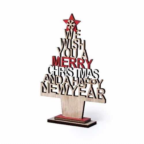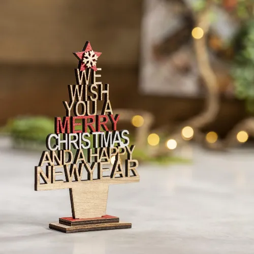 Eye catching, wooden Xmas tree with die cut message.