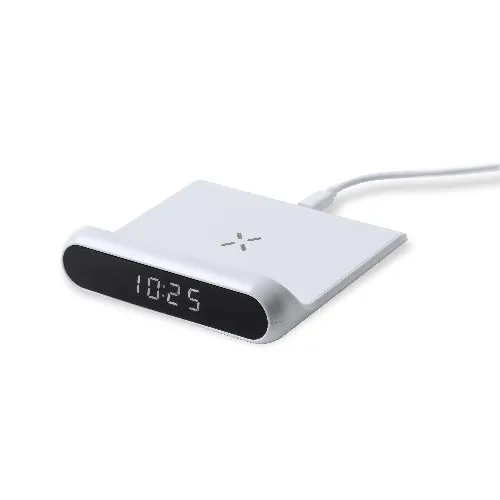 Multifunction clock with backlit display and integrated 10W wireless charger.