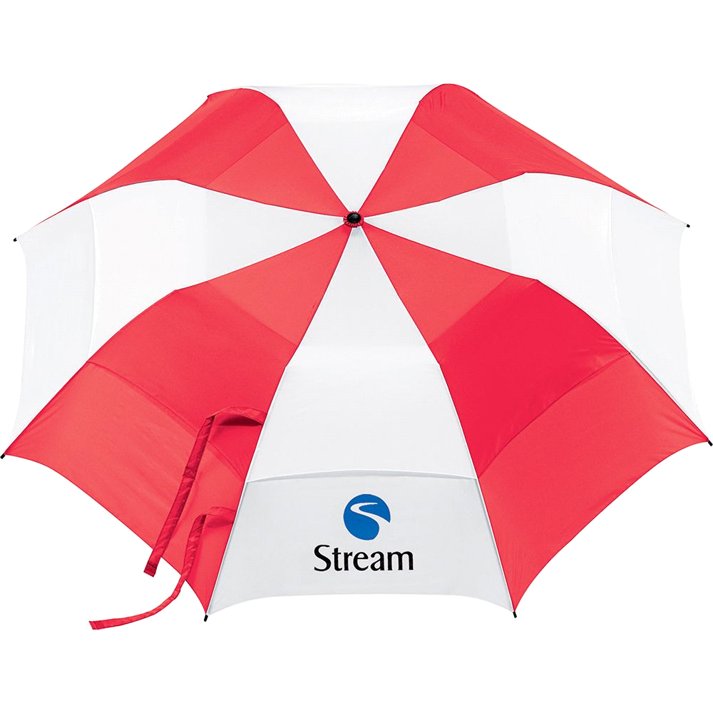 Automatic opening vented folding umbrella. Large vented pongee canopy with matching colour case which includes a shoulder strap.