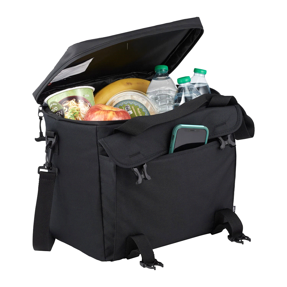 Made from recycled 600D polyester, Front exterior pocket with side release buckle closure, Removable, adjustable shoulder strap, Waterproof zipper, Waterproof black PEVA lining, Durable easy-grab zipper pulls. Packaging: Bulk. Materials: Recycled 600D Polyester