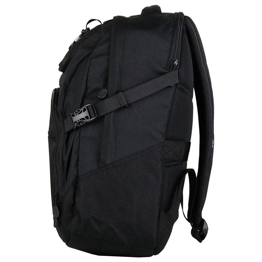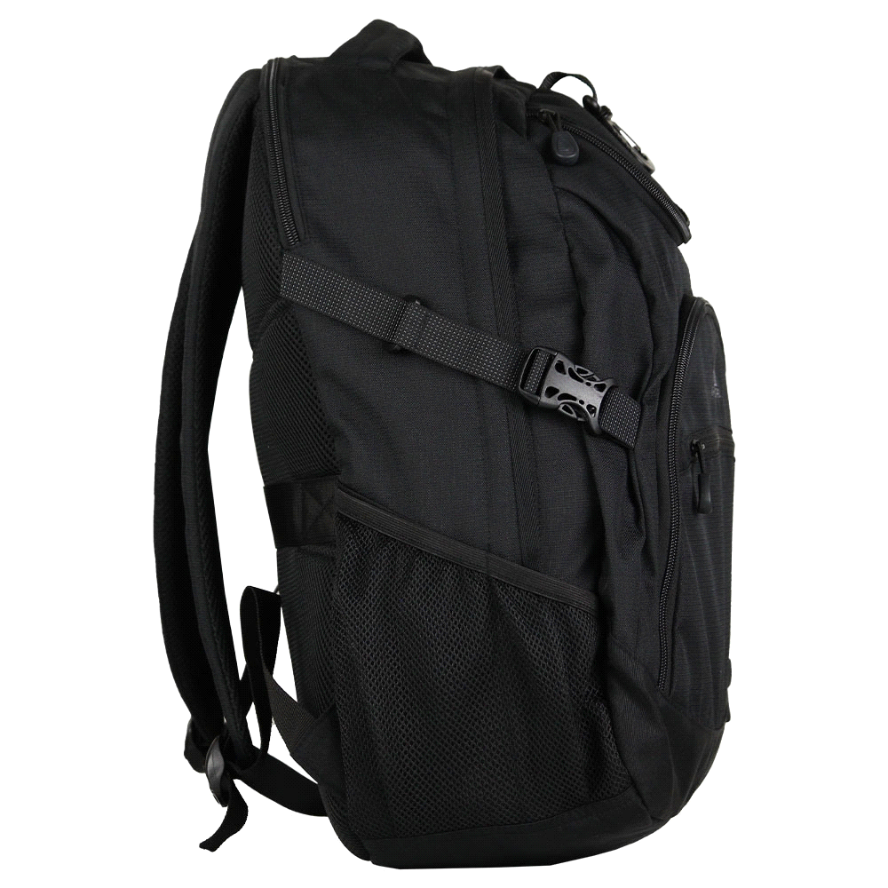 16 lockable padded laptop compartment, nylon-lined phone/ sunglasses pocket, multi-compartment design, large front zip pocket with an internal mesh zip storage section. Large main compartment, external hat attachment clip, adjustable shoulder straps and gusset straps for compact storage. Side beverage pocket, and padded Airflow back panel. Also supplied with a back open webbing strap to store over handled luggage. Packaging: Bulk. Materials: Polyester/Ripstop